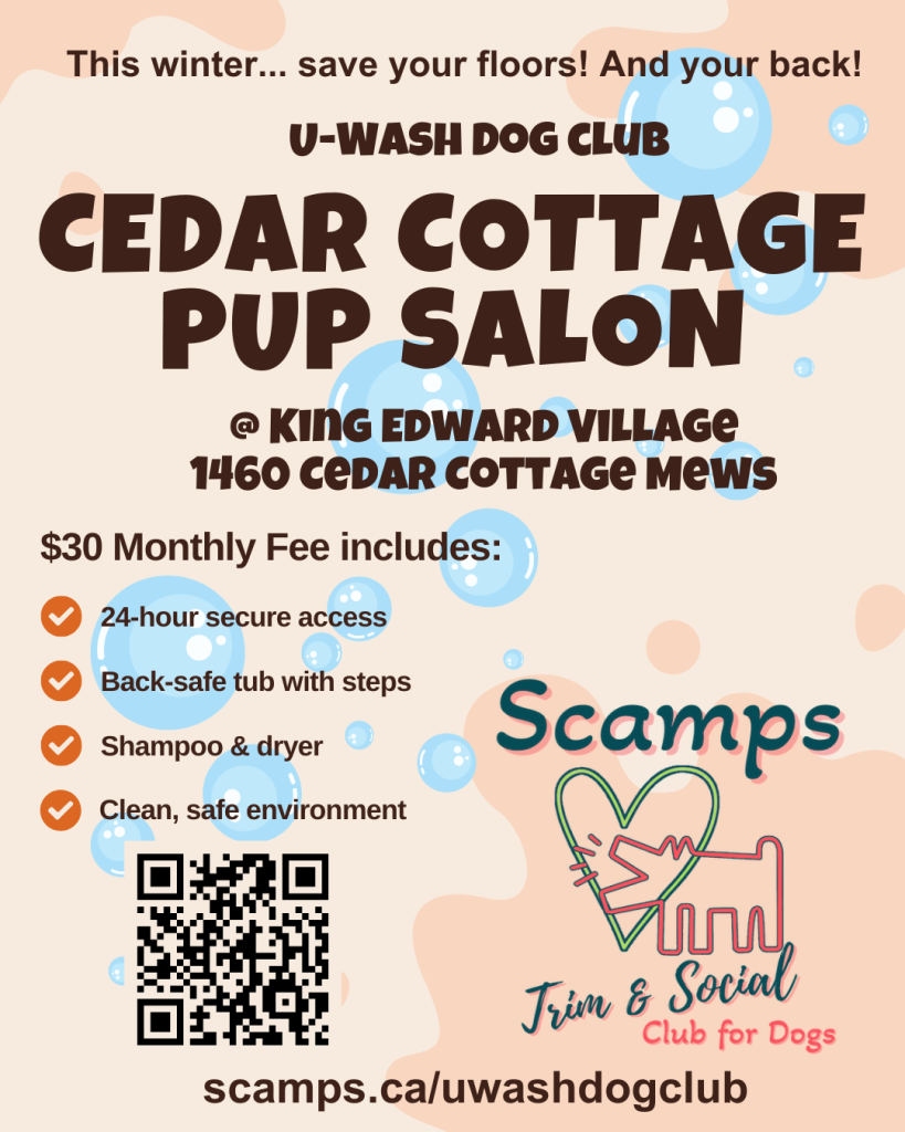Our pup salon, at 1460 Cedar Cottage Mews, is available to members 24/7, with secured access, supportive facilities, shampoo, blow dryer, and a cozy environment that we keep clean and ready.